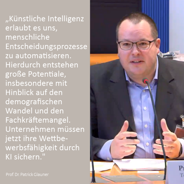 Prof. Dr. Glauner: KI erlaubt es uns, menschliches Entscheidungsverhalten zu automatisieren oder immerhin teilweise zu unterstützen. Dadurch können Entscheidungen schneller, günstiger und besser getroffen werden. In einer vernetzten und agilen Arbeitswelt hilft sie Führungskräften, schneller und präziser auf Veränderungen zu reagieren, Ressourcen effizienter zu steuern und Mitarbeitende gezielter zu unterstützen.