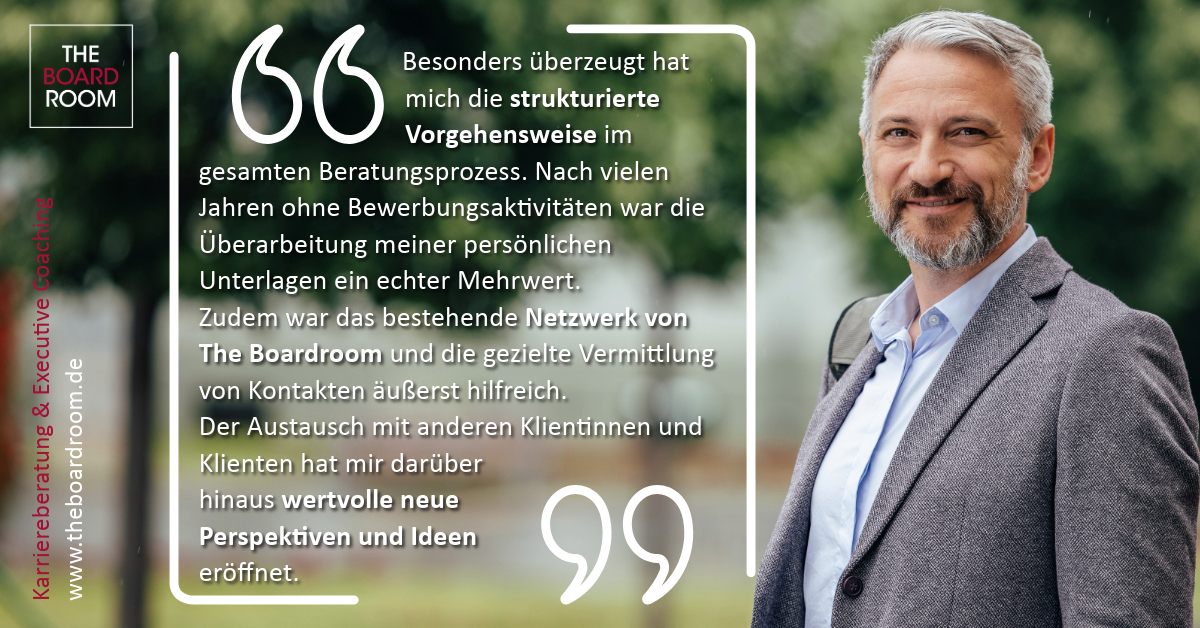 Lesen Sie, was unsere Klienten über ihre Bewerbungsaktivitäten während unserer Karriereberatung und unser The Boardroom Netzwerk berichten.
